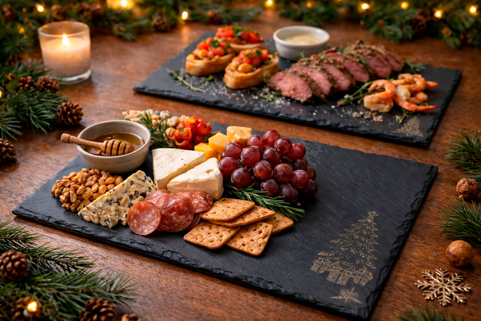 Nuestra clásica bandeja de pizarra cerámica ahora también con motivos navideños grabados: árboles, lazos y adornos para vestir tu mesa con un toque festivo y elegante. Perfectas para presentar aperitivos, dulces navideños o como regalo original estas fiestas.